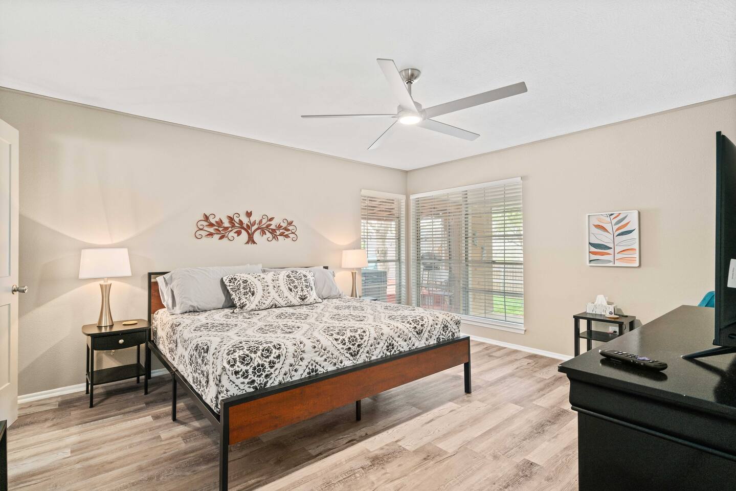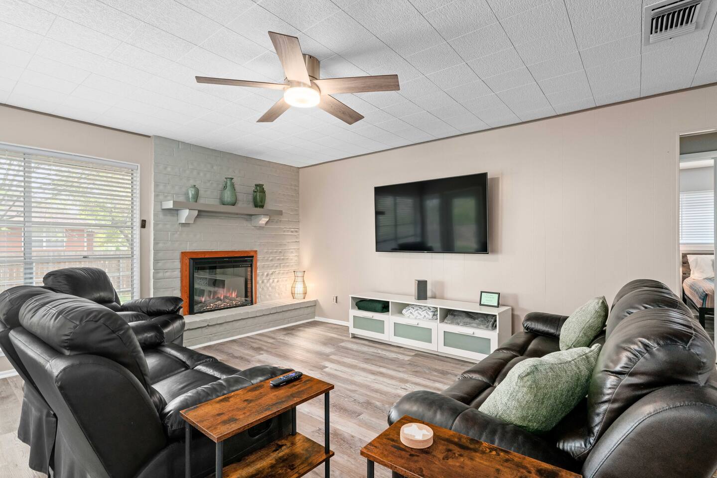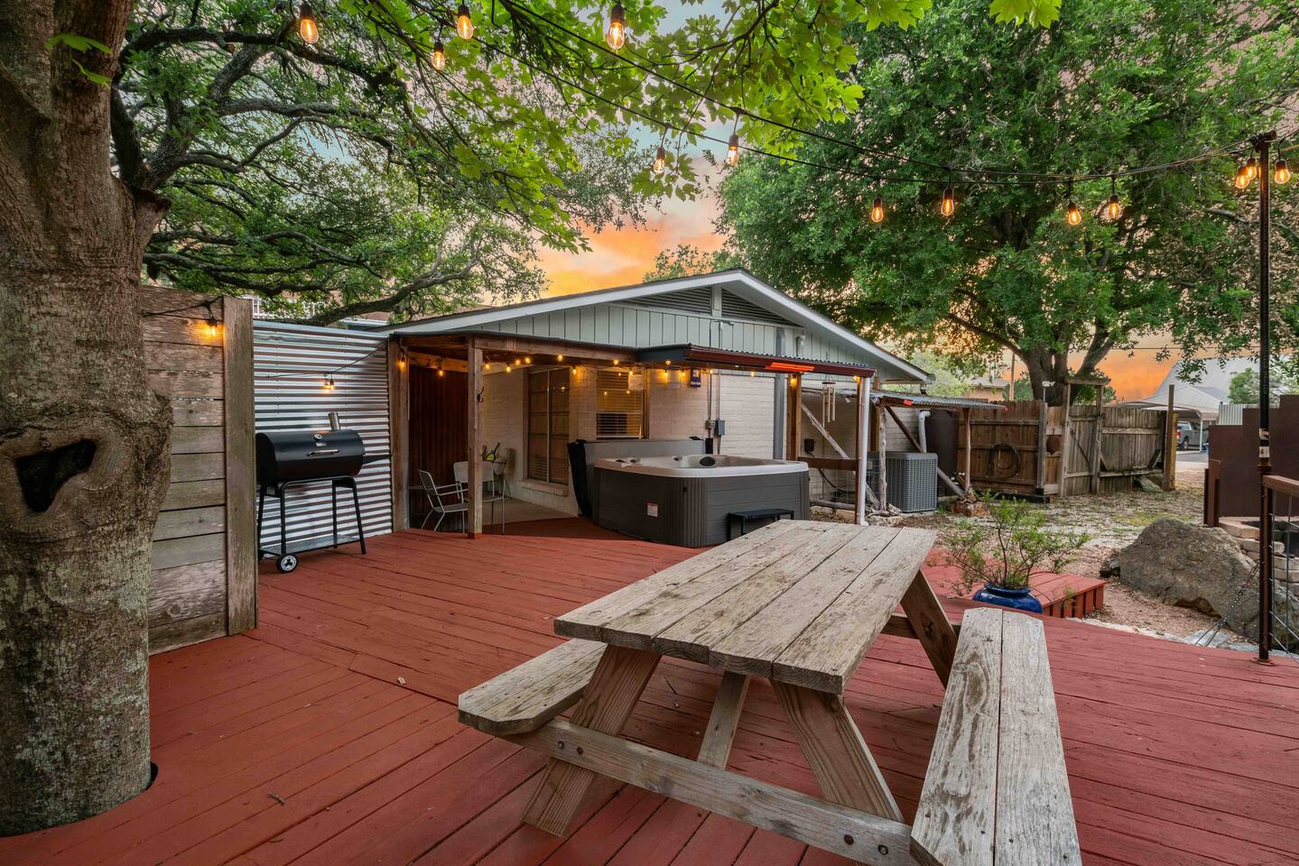 Escape with your friends & family to our serene retreat in Canyon Lake! (between Austin & San Antonio-a quick drive to New Braunfels). Minutes away from the lake or river and a few steps out the back door for relaxation in your private HOT TUB! Cap off your days of adventure or wine tasting by unwinding beside the outdoor fireplace or dining on the deck. With a fully equipped kitchen and a BONUS room, every comfort awaits in this inviting single-story home!